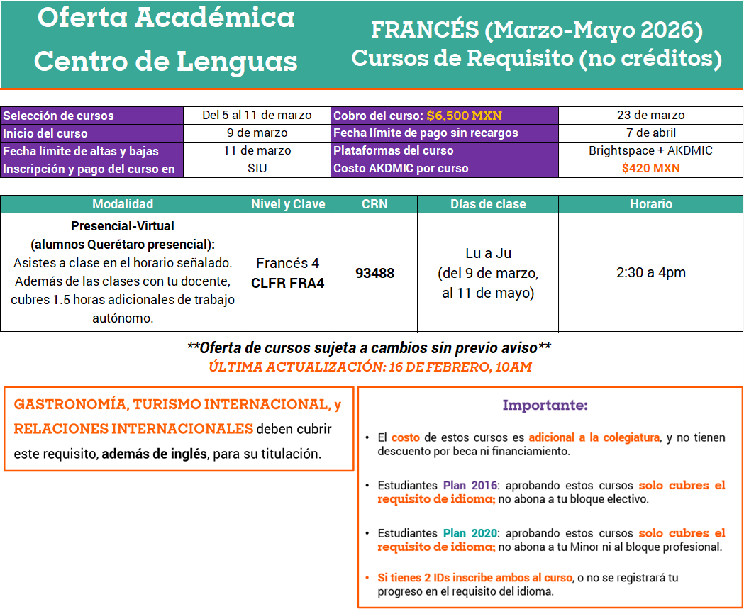El requisito de inglés del Centro de Lenguas es indispensable para tu titulación. Recuerda que conforme avances en tu licenciatura, debes ir acreditando los niveles del idioma para evitar restricciones de créditos.